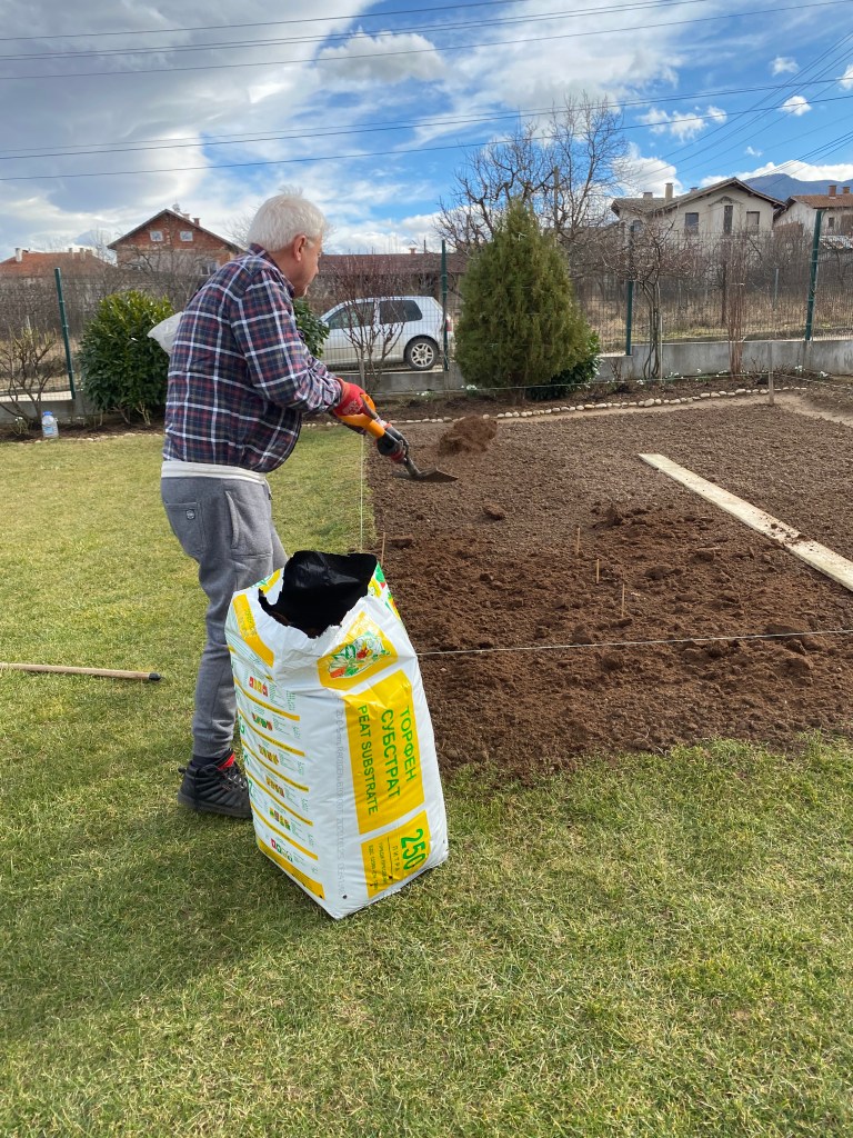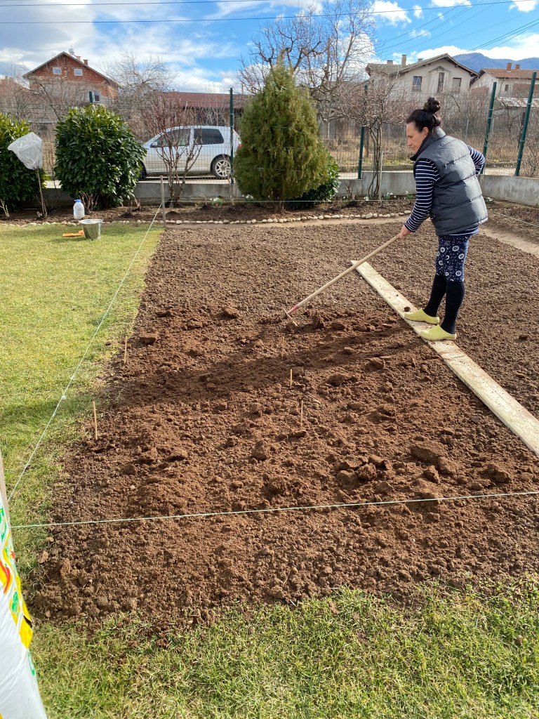 Започваме с дълбоко обръщане на пръстта с права лопата с цел да изчистим от корени и камъчета, останали от предходния сезон. След това използваме гребло за да раздробим буците и да заравним.