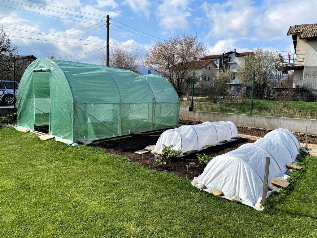 Тази година пролетта е хладна и дъждовна, което наложи да поставим парник и тунели. В парника са краставиците и доматите, а под тунелите – лук, тиквички, целина, магданоз и спанак.
