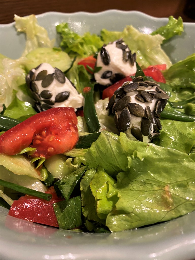 СВЕЖА САЛАТА С ТОПКИ ОТ КРЕМА СИРЕНЕ И ТИКВЕНИ СЕМКИ