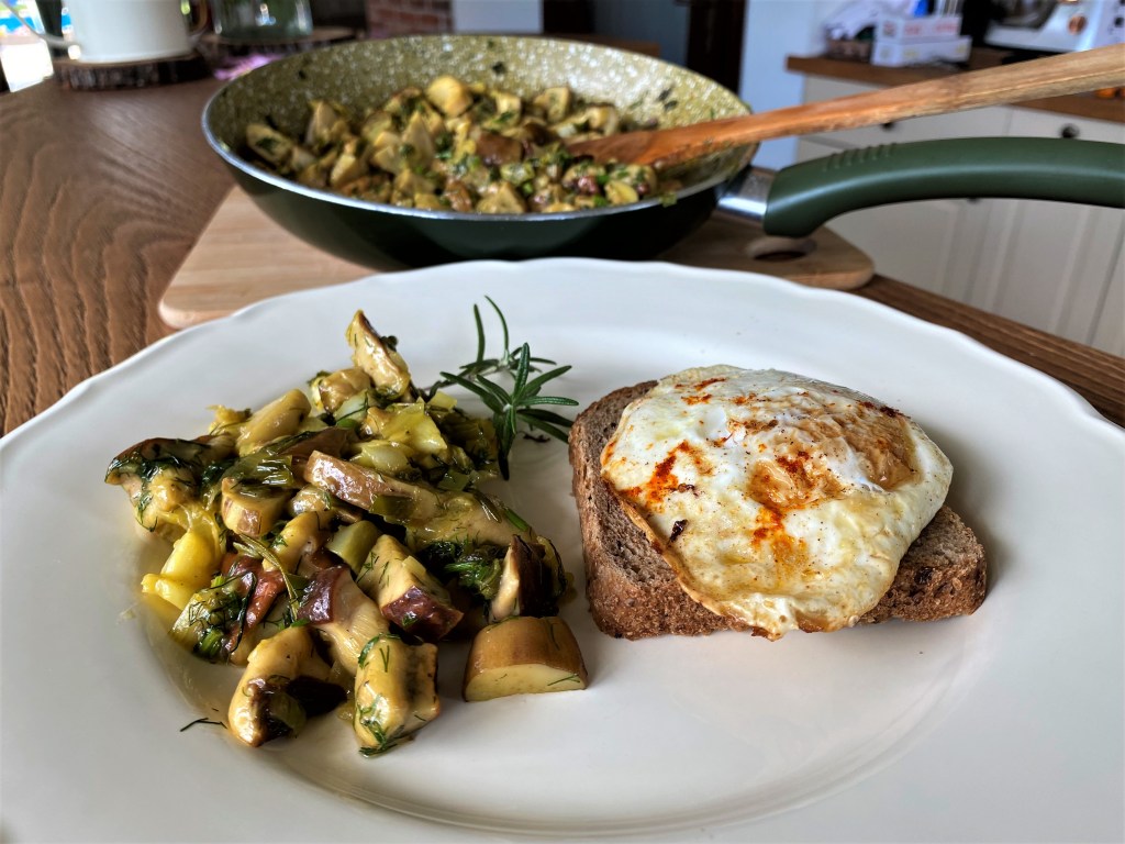 Микс от гъби на тиган с яйце върху препечен пълнозърнест хляб