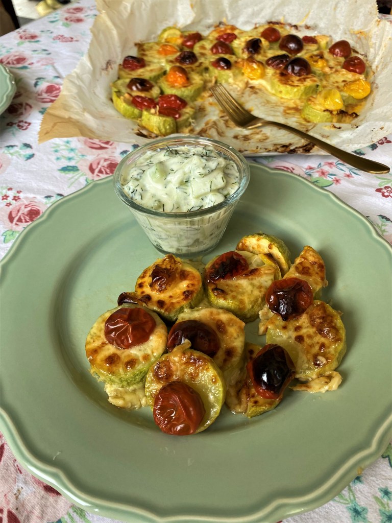 Тиквичките са нарязани на шайби, а богатият аромат на сиренето грюер се разстила нежно върху тях. Печените доматчета чери придават една допълнителна нотка сладост.