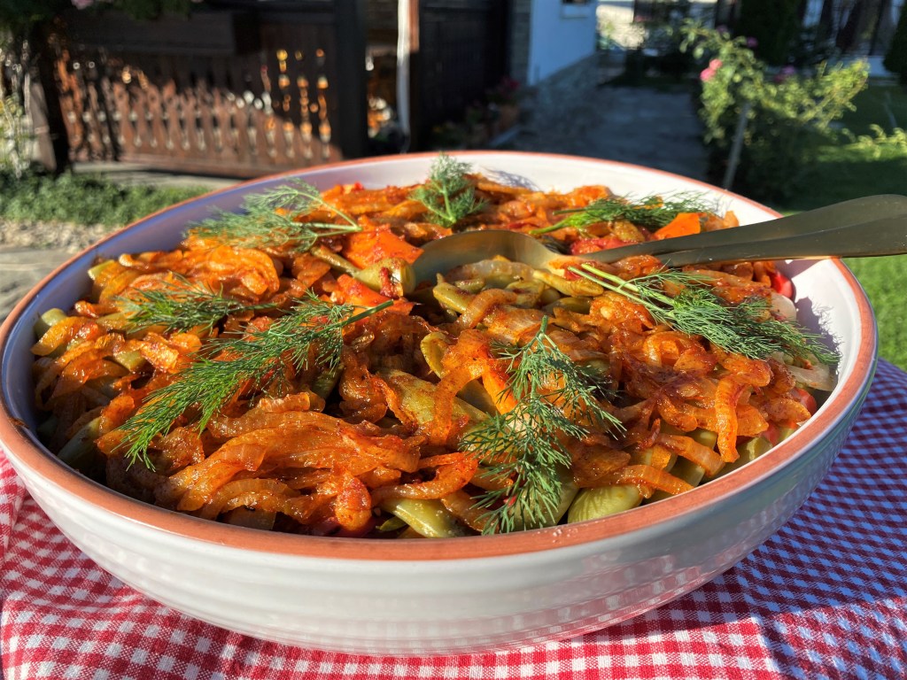 ЗЕЛЕН БОБ С МОРКОВИ, ЧУШКИ, ДОМАТИ И ЗАПЪРЖЕН ЛУК – приятна комбинация от сезонни зеленчуци, които ние комбинираме със салата Снежанка и сервираме както на обяд така и за вечеря.
