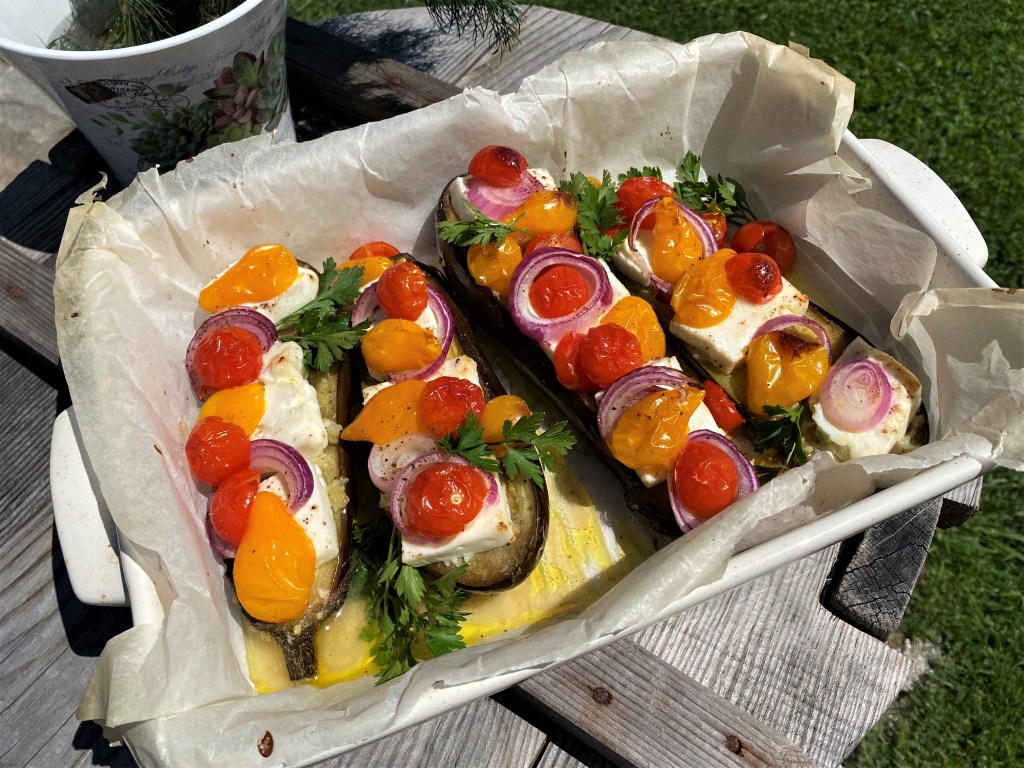 ПАТЛАДЖАН НА ФУРНА С ОВЧЕ СИРЕНЕ, ЧЕРИ ДОМАТЧЕТА И ЛИЛАВ ЛУК