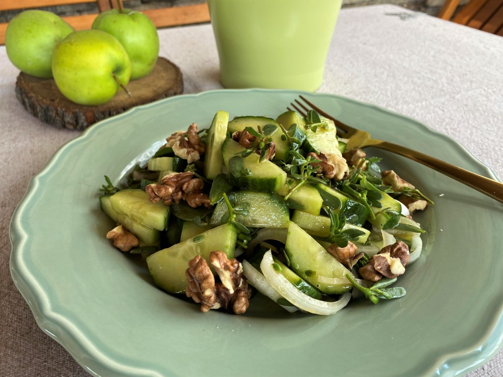 ЛЯТНА САЛАТА С ТУЧЕНИЦА – краставица, лук, орехи, медено-балсамов дресинг и … тученица 🙂