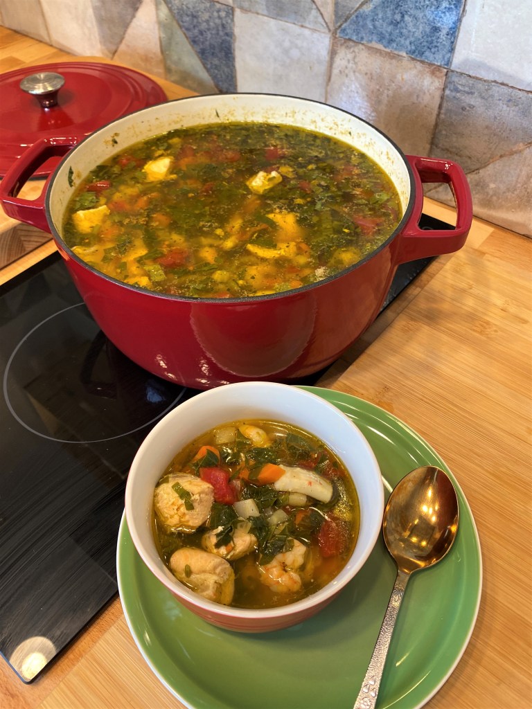 РИБЕНА СУПА – вкъщи я приготвяме с прясна сьомга, морски дарове, моркови, домати, лук и девесил /листа/.