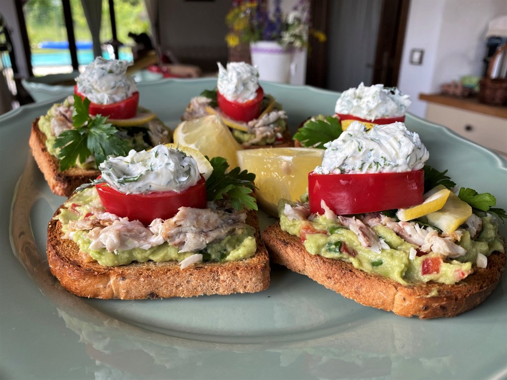 РИБЕН САНДВИЧ – препечени филиики пълнозърнест хляб с авокадо, лук и домати, филенца бяла риба с лимон и листа целина и за завършек червена пиперка с крема сирене и копър – една наистина свежа комбинация за ценители 🙂