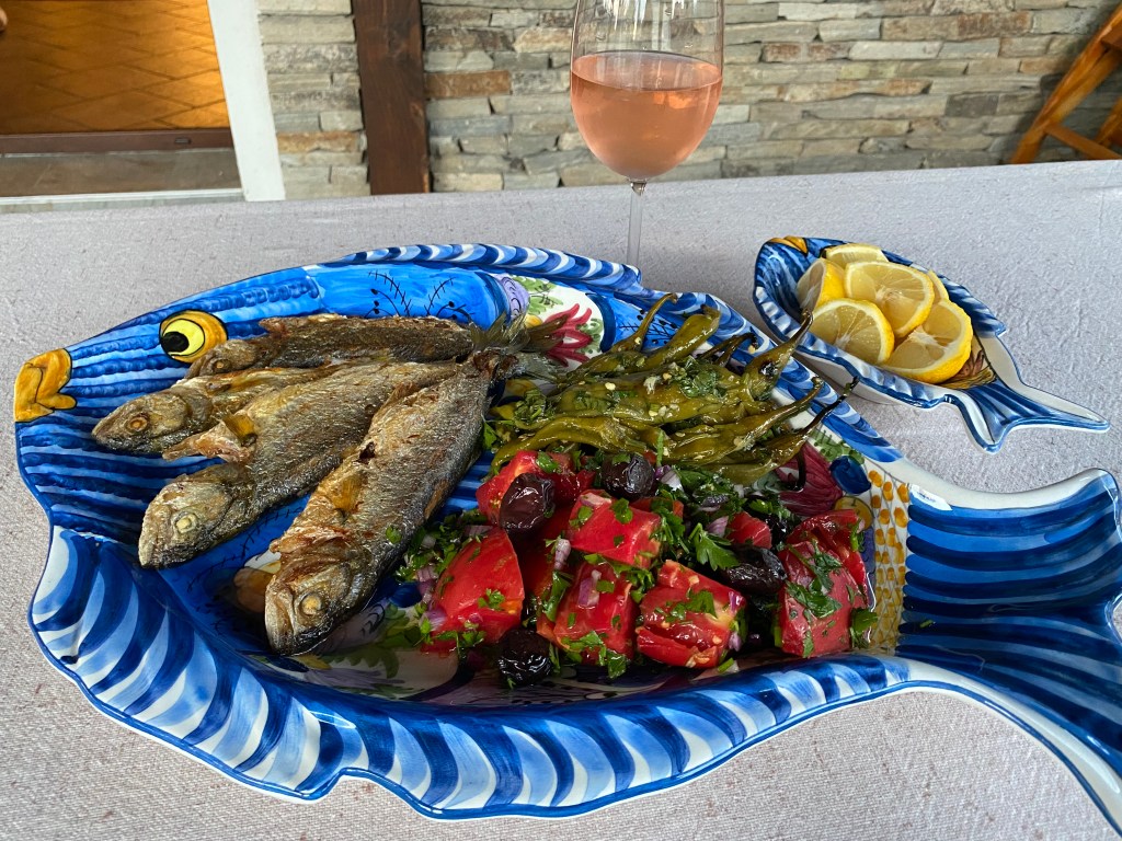 ЧЕРНОКОП НА ТИГАН със салата от градински домати, маслини и чушки /рибки/ с марината от зелени подправки и чесън. Комбинирано с пресен лимон и чаша вино – неустоимо 🙂