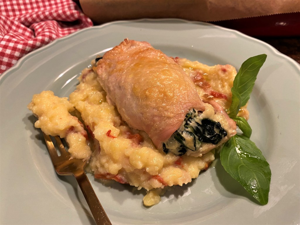 РУЛЦА ОТ ПИЛЕШКИ ФИЛЕТА ПЪЛНЕНИ СЪС СПАНАК И СМЕТАНА – сервирах тази нежна вкусотия върху картофено пюре с нарязани печени пиперки. Рецептата можете да намерите на blagina.bg в рубриката Рецепта на месеца.