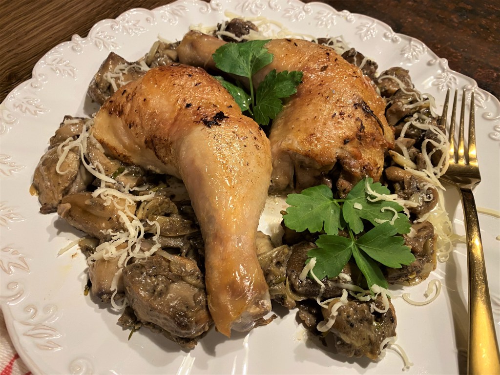 ПЪЛНЕНИ ПИЛЕШКИ БУТЧЕТА – рецептата взаимствах от Рик Стайн, който при посещението си във Франция приготви пълнеж от задушени гъби, кашкавал, крема сирене и мащерка и запече бутчетата за 25 минути на 200 градуса. Тъй като използвах замразени манатарки, тези, които не сложих в пълнежа сервирах с настърган пармезан като гарнитура към бутчетата.