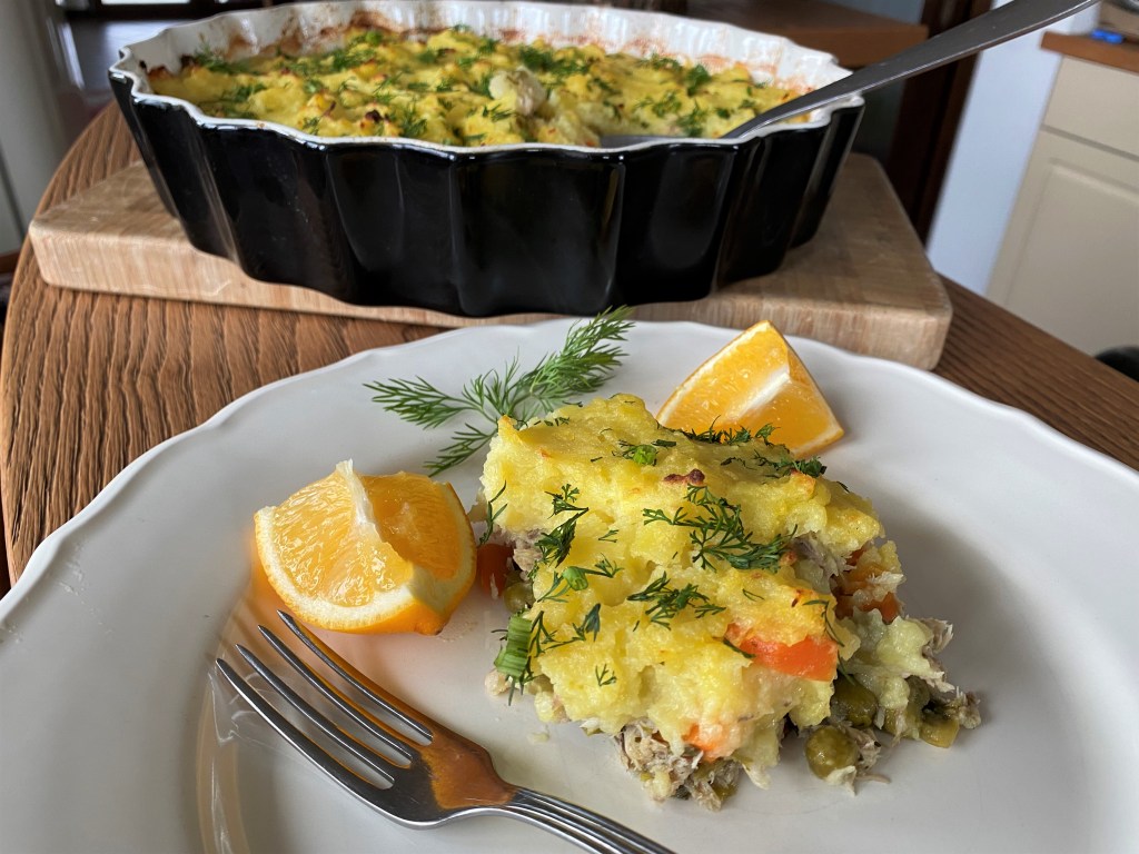 Рибен пай – приготвих го по подобна на пилешкия пай рецепта с моркови, целина, пащърнак, грах и картофи. Стана много лек и приятен.
