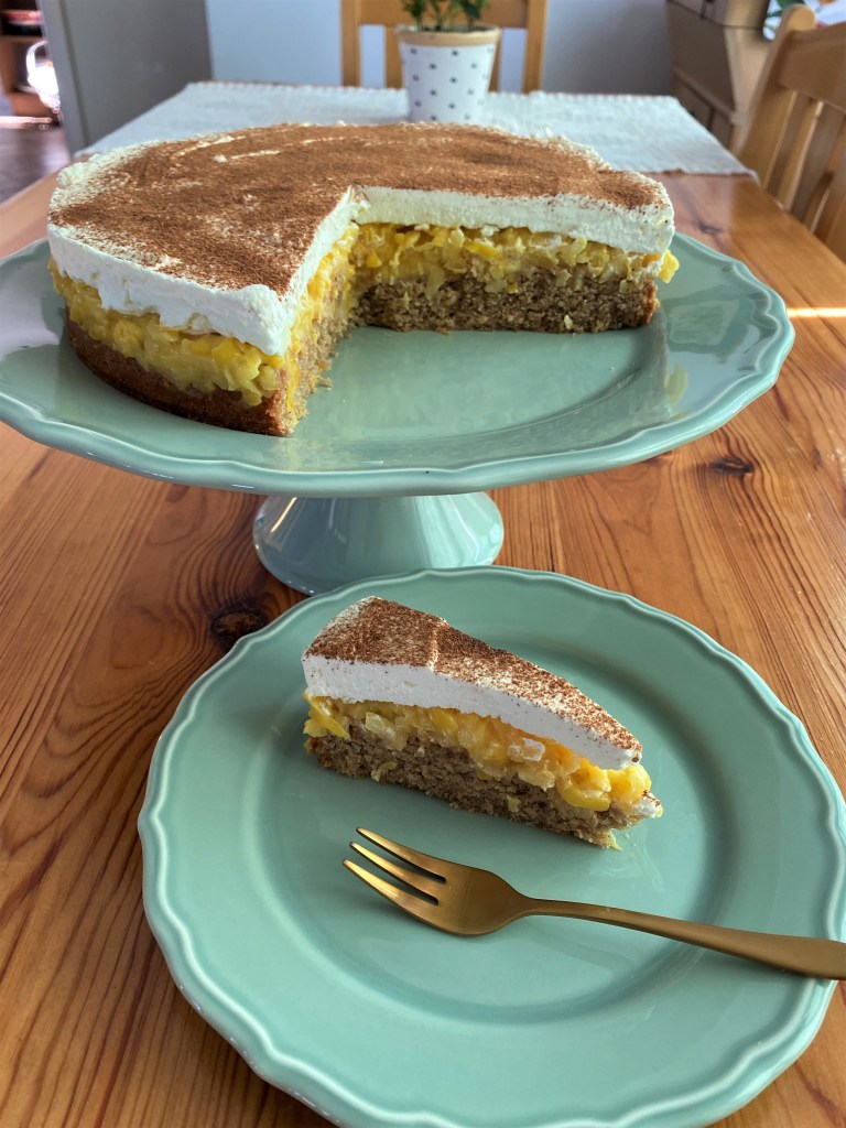 Торта БЛАГИНА – лек лешников блат, мус от ябълки и манго, ефирен сметанов топинг с какао.