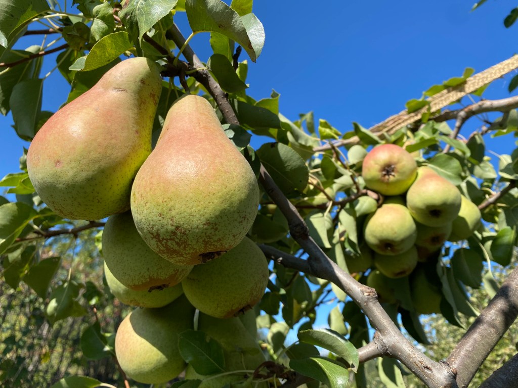 За разлика от ябълката крушата се наложи да я подпрем и вържем, че да издържи всички плодове.