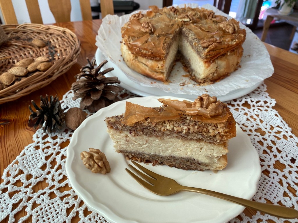 И Димитровден мина, уж от брадата му като яздел коня капел първият сняг, но тази година зимата не бърза. От друга страна, този празник все още го усещам и като професионален, затова на трапезата освен пилешката яхния имаше и нов модел десерт – баклава-чийзкейк 🙂
