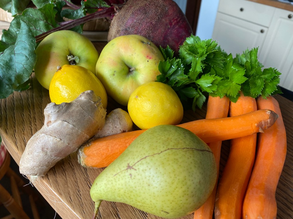 През октомври започнахме и с активна грижа за подсилване на имунната ни система. Като начало сутрешни фрешове от нашите ябълки, круши, моркови, червено цвекло, листа целина, домашен лимон и джинджифил. Освен имуностимулиращо, този прясно изцеден сок действа и пречистващо и детоксикиращо. Опитайте, и сами ще се убедите в неговата сила.