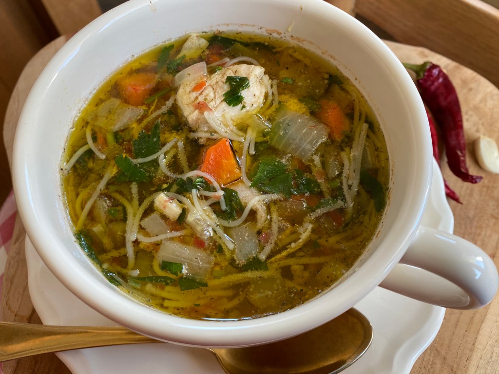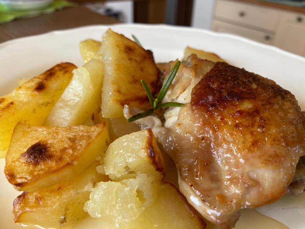 Едно пиле, което се превърна в топла пилешка супа и запечени бутчета с картофи.